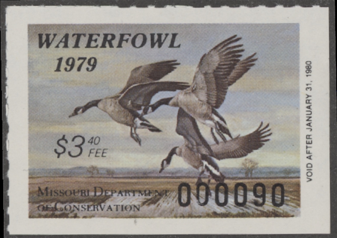 MO1 1979 State Duck Stamp. Mint Never Hinged. Very Fine. Low Serial Number. Canada Geese by Charles W. Schwartz.