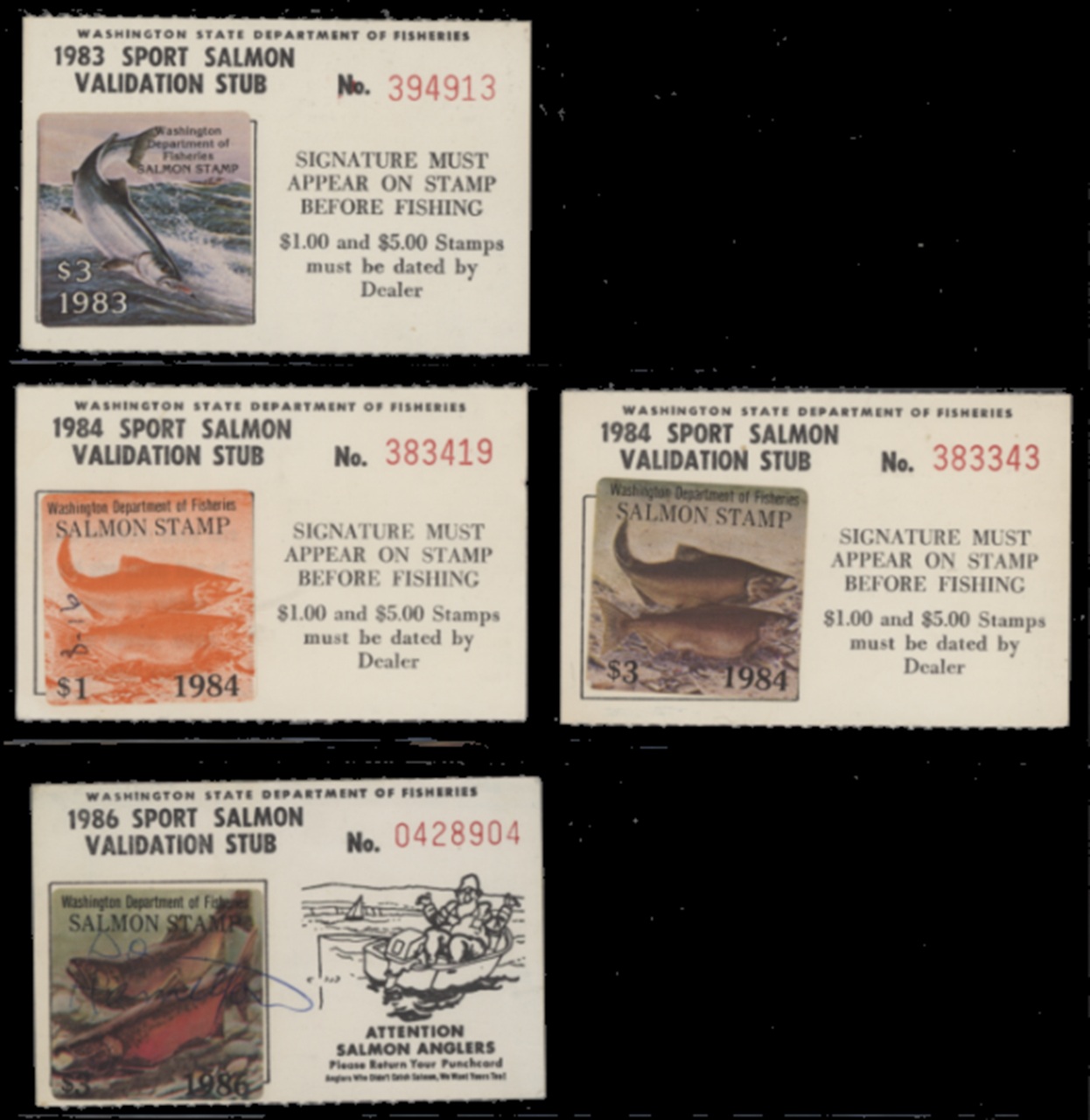 1983 - 86 Washington State Salmon Stamps SKU: 16735 Free shipping $12.00 Qty: Add to cart Custom wishlist OK Add to wishlist Email a friend 1983 - 1986 Washington State Salmon Stamps on Sport Salmon Validation Stubs. Used, Signed. Products specifications Attribute name Attribute value Catalog Number WAS* Condition Used Centering TLA VF Centering Very Fine Subject Salmon Stamps 79-86 Year 1983