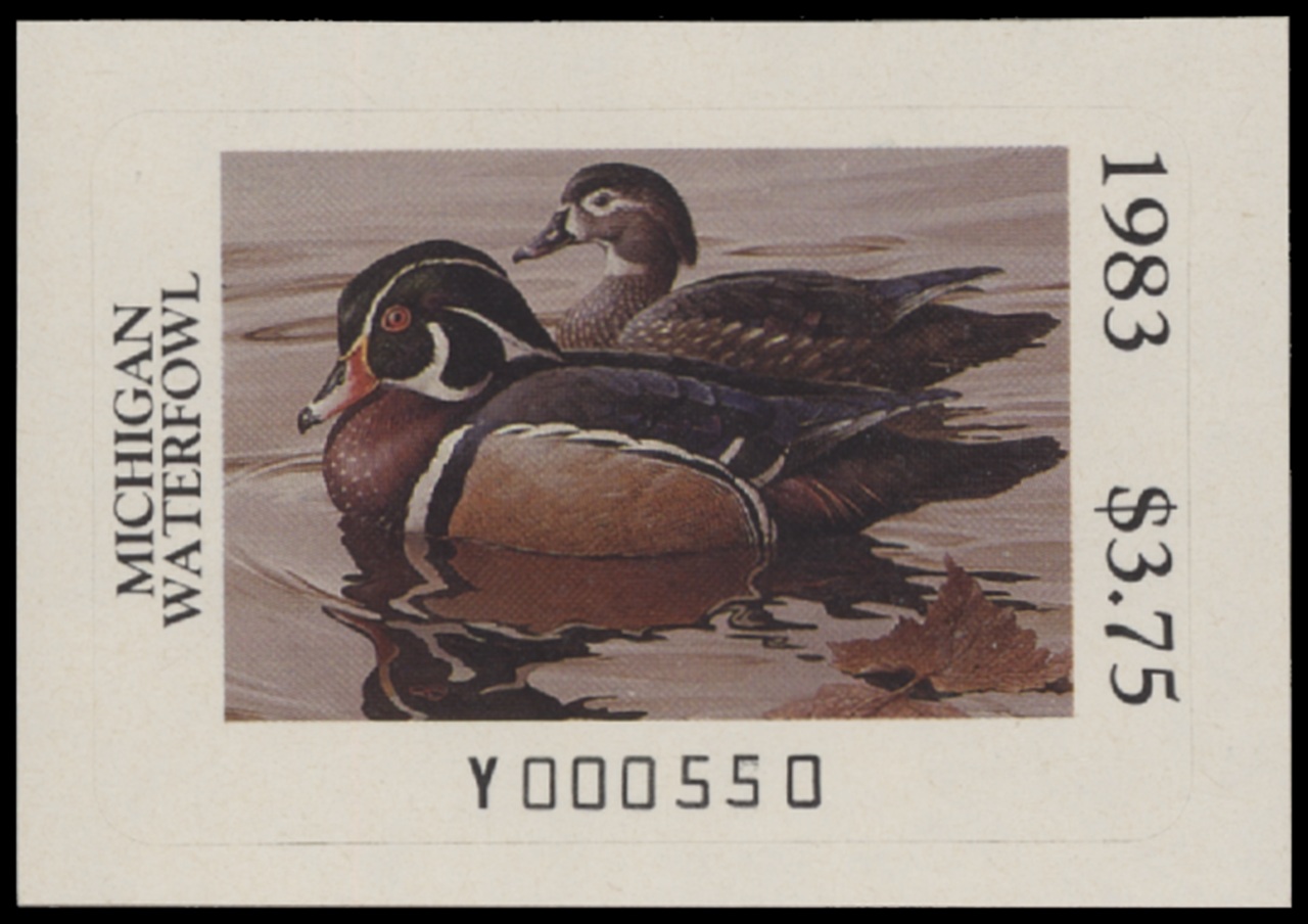 MI8 1983 State Duck Stamp. Mint Never Hinged. Very Fine. Wood Ducks by Rod Lawrence.