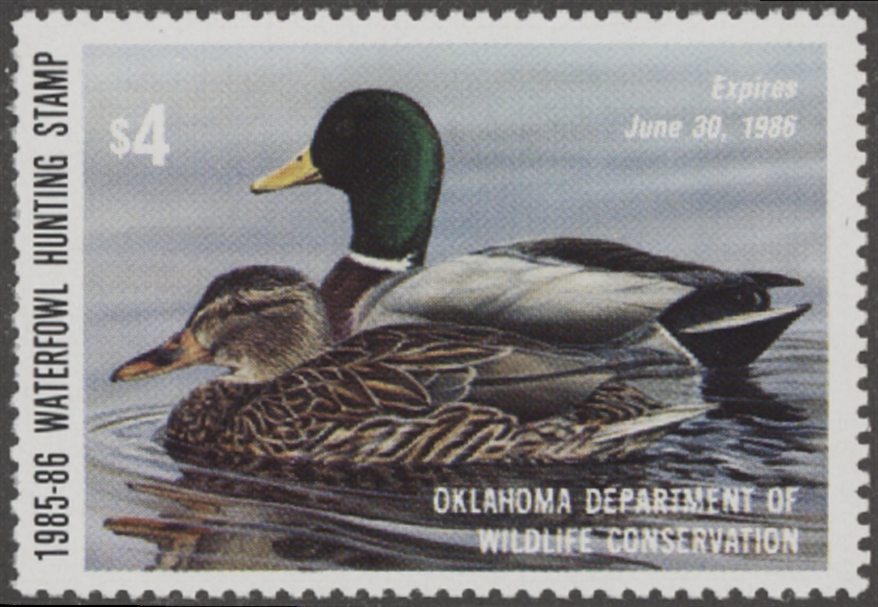 OK6 1985 State Duck Stamp. Mint Never Hinged. Very Fine. Mallards by Gerald Mobley.