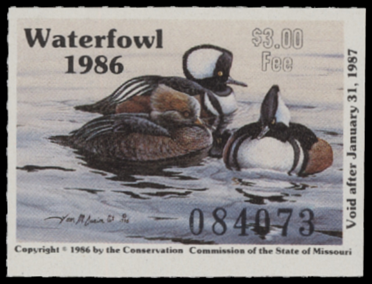 MO8 1986 State Duck Stamp. Mint Never Hinged. Very Fine. Hooded Mergansers by Tom Crain.