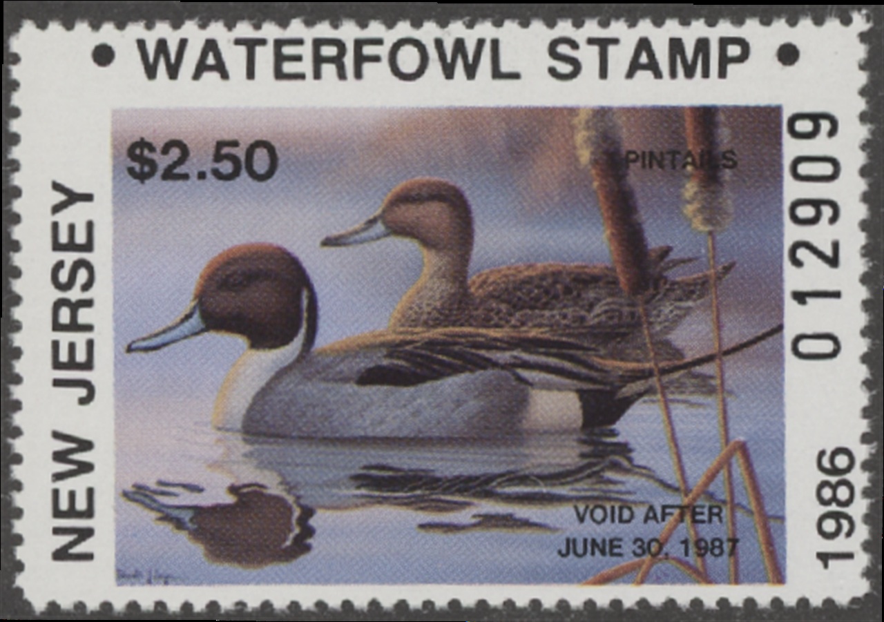 NJ3 1986 State Duck Stamp. Mint Never Hinged. Very Fine. Pintails by Ronald L Louque.
