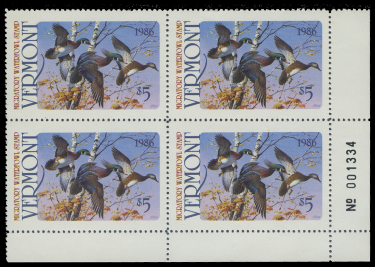 VT1 1986 State Duck Stamp. Mint Never Hinged. Very Fine. Wood Ducks by Jim Killen.