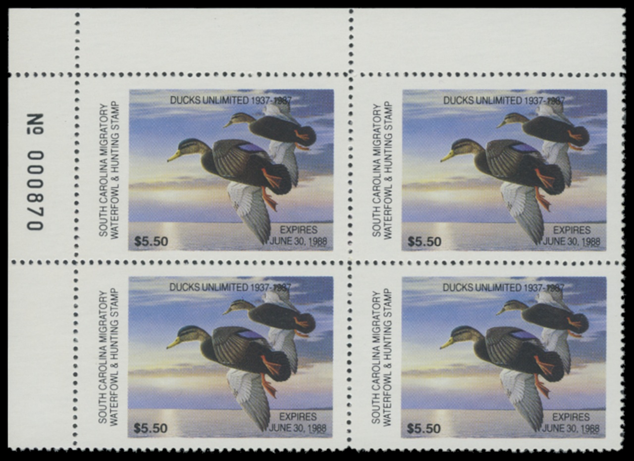 SC7 1987 State Duck Stamps. Mint Never Hinged. Very Fine. Black Ducks by Steven Dillard.