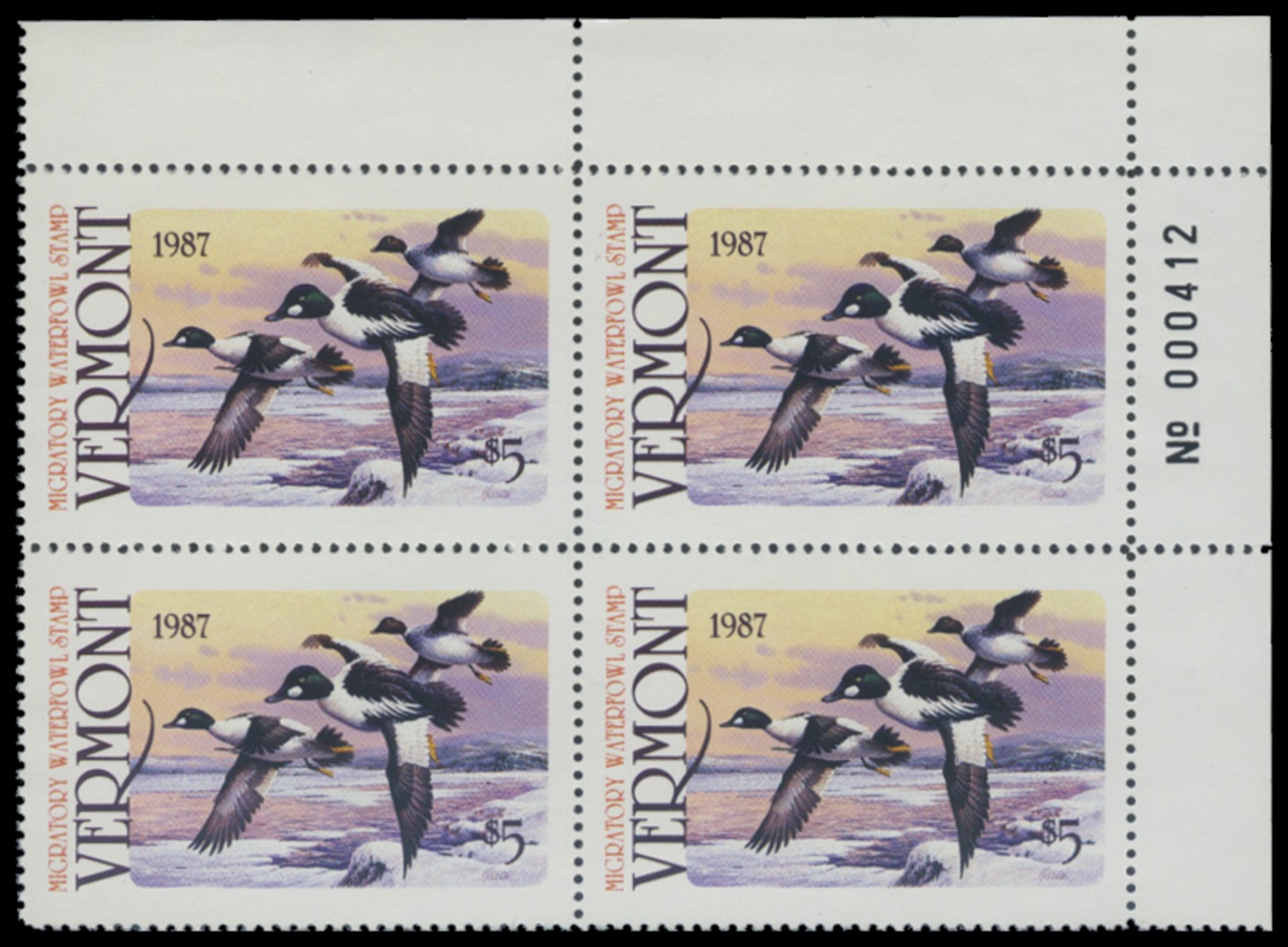 VT2 1987 State Duck Stamp. Mint Never Hinged. Very Fine. Common Goldeneyes by Jim Killen. Block of 4