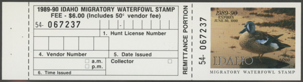 ID3H 1989 State Duck Stamp. Mint Never Hinged. Very Fine. Blue-wing Teal by Daniel Smith. Hunter Type with Tab.