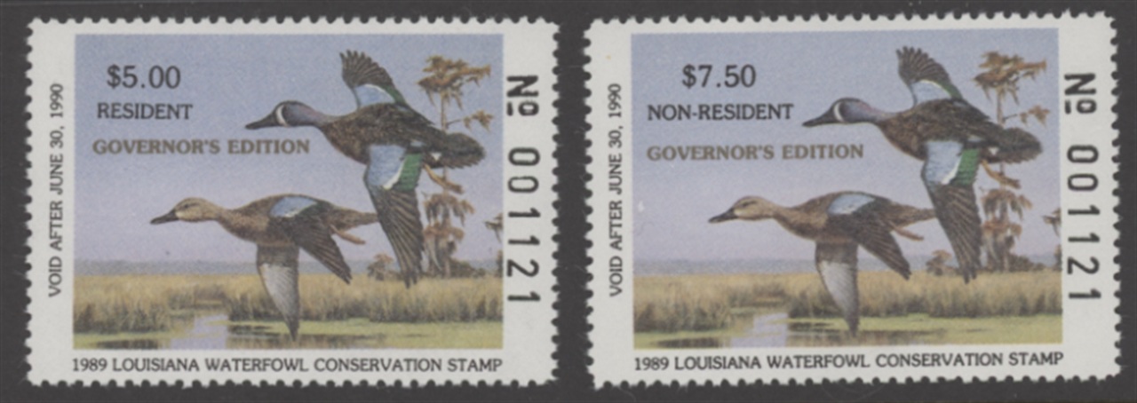 LA1G/LA1GA 1989 State Duck Stamp. Governor's Edition Resident and Non Resident with Matching Serial Numbers. Mint Never Hinged. Very Fine. Blue-wing Teal by David Noll.