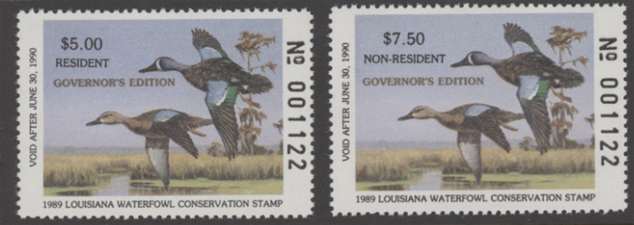 LA1G/LA1GA 1989 State Duck Stamp Governor's Edition. Resident and Non Resident with Matching Serial Numbers. Mint Never Hinged. Very Fine. Blue-wing Teal by David Noll.
