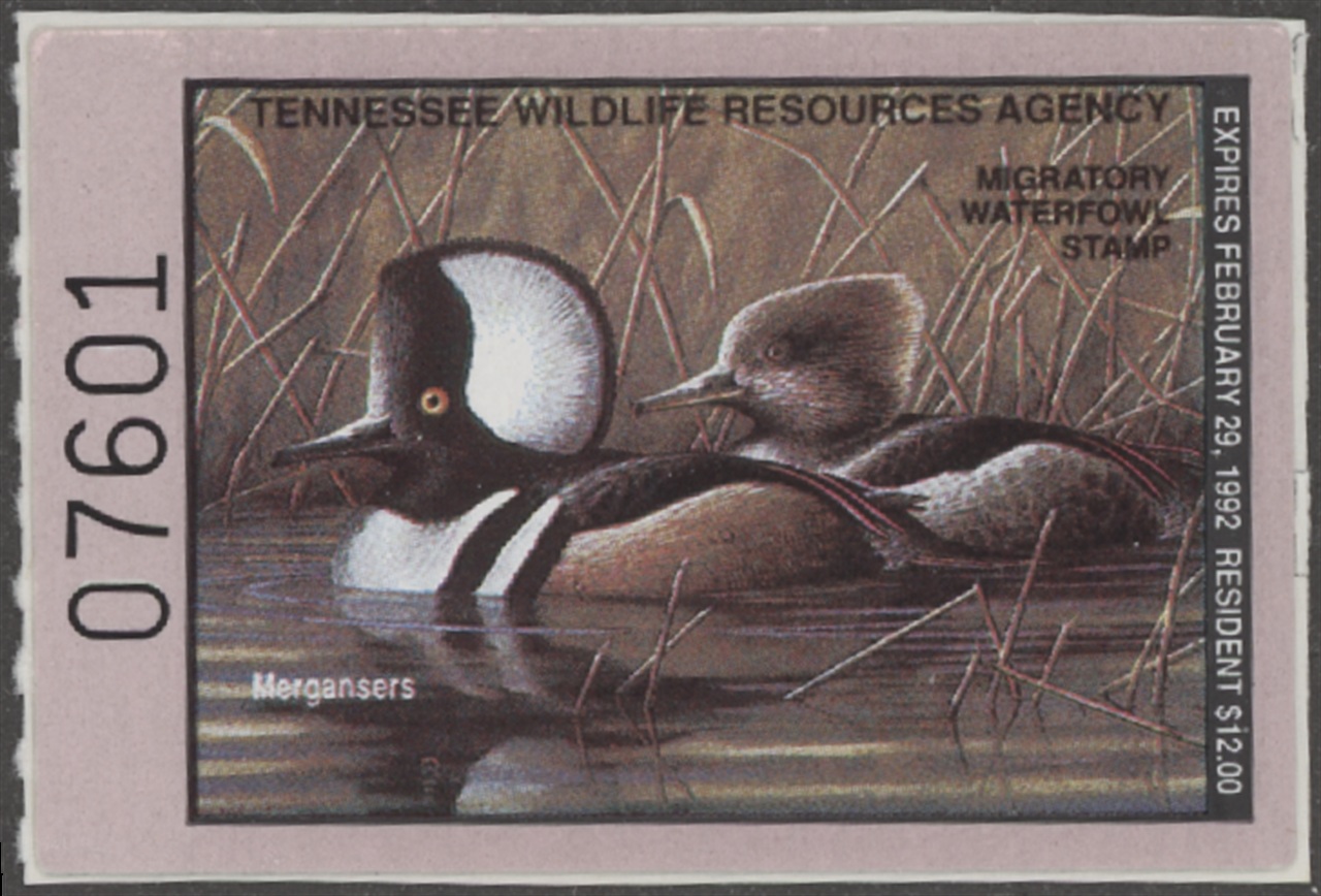 TN13 1991 State Duck Stamp. Mint Never Hinged. Very Fine. Hooded Mergansers by Richard Clifton.