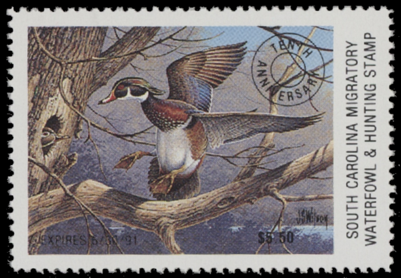 SC10 1990 State Duck Stamp. Mint Never Hinged. Very Fine. Wood Ducks by John S. Wilson.