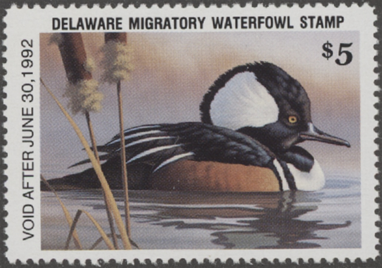 DE12 1991 State Duck Stamp. Mint Never Hinged. Very Fine. Hooded Merganser by Ron J. Louque.
