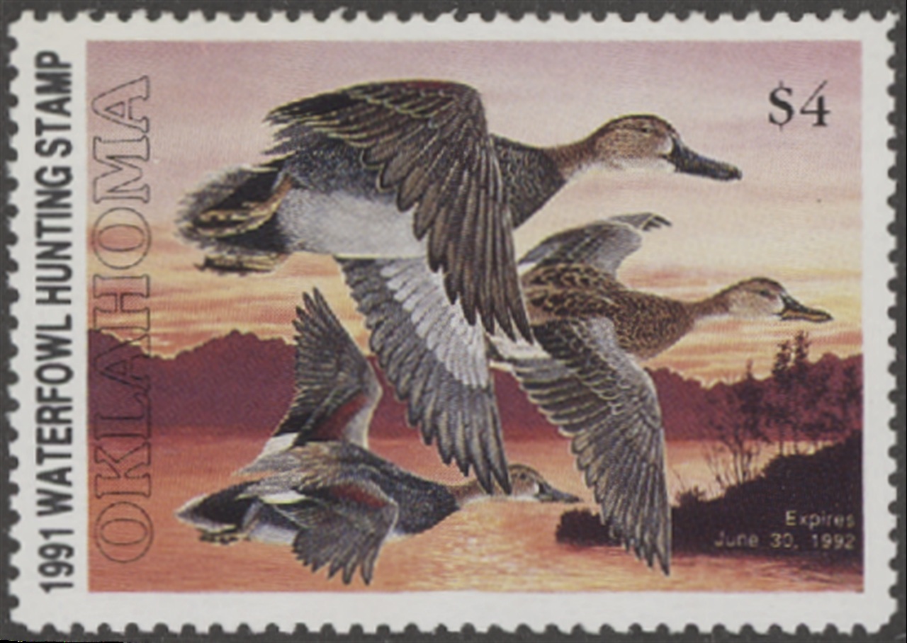OK12 1991 State Duck Stamp. Mint Never Hinged. Very Fine. Gadwalls by Rayburn T. Foster.