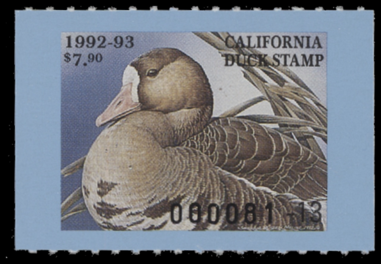 1992 California Duck Stamp Catalog Number: CA22Condition: MNHCentering: VF> SKU: 17416 Free shipping $9.00 Qty: Add to cart Custom wishlist OK Add to wishlist Email a friend CA22 1992 State Duck Stamp. Mint Never Hinged. Very Fine. White-front Geese by Sherrie R. Meline. Products specifications Attribute name Attribute value Catalog Number CA22 Condition MNH, Mint Never Hinged Centering TLA VF Centering Very Fine Year 1992 Artist Sherrie R. Meline Subject White-Front Geese