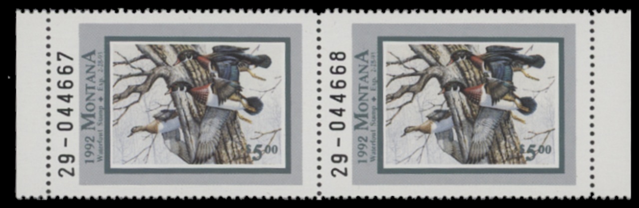 1992 Montana Duck Stamp Catalog Number: MT7Condition: MNHCentering: VF> SKU: 17126 Free shipping $14.00 Qty: Add to cart Custom wishlist OK Add to wishlist Email a friend MT7 1992 State Duck Stamp Pair. Mint Never Hinged. Very Fine. Wood Ducks by Craig Phillips. Products specifications Attribute name Attribute value Catalog Number MT7 Condition MNH, Mint Never Hinged Centering TLA VF Centering Very Fine Year 1992 Artist Craig Phillips Subject Wood Ducks