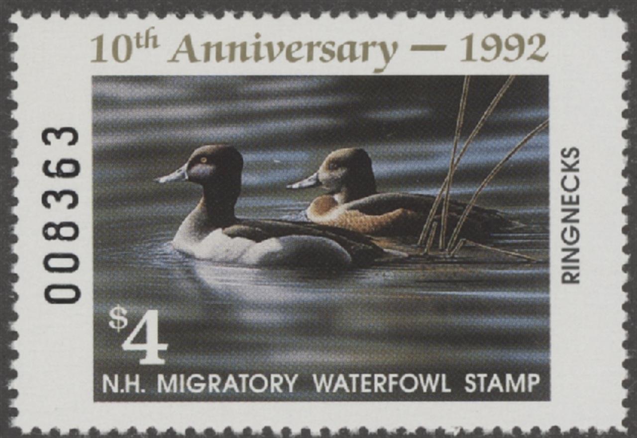 NH10 1992 State Duck Stamp. Mint Never Hinged. Very Fine. Ring-necked Ducks by Richard Clifton.