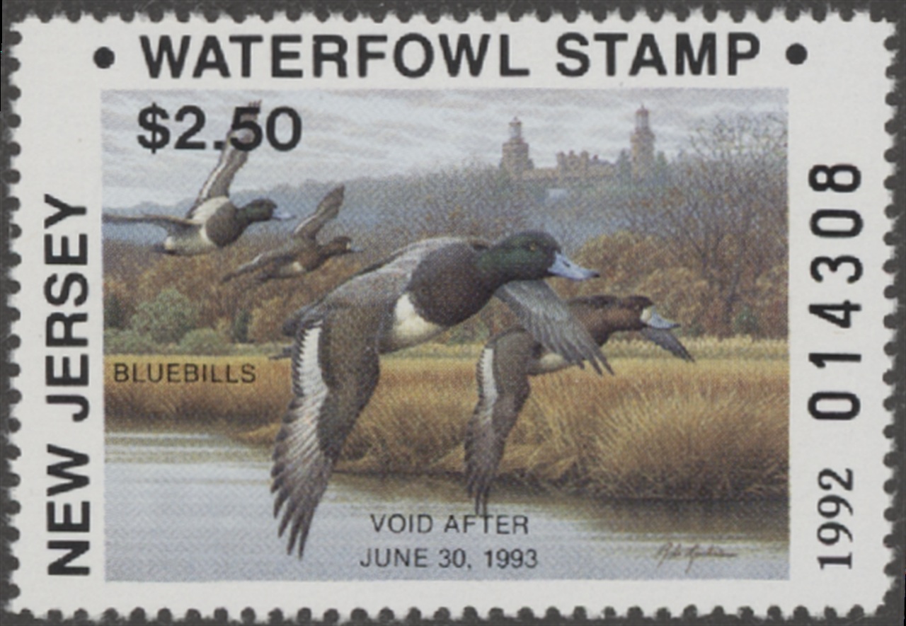 NJ9R 1992 State Duck Stamp. Mint Never Hinged. Very Fine. Bluebill Ducks by Rob Leslie.