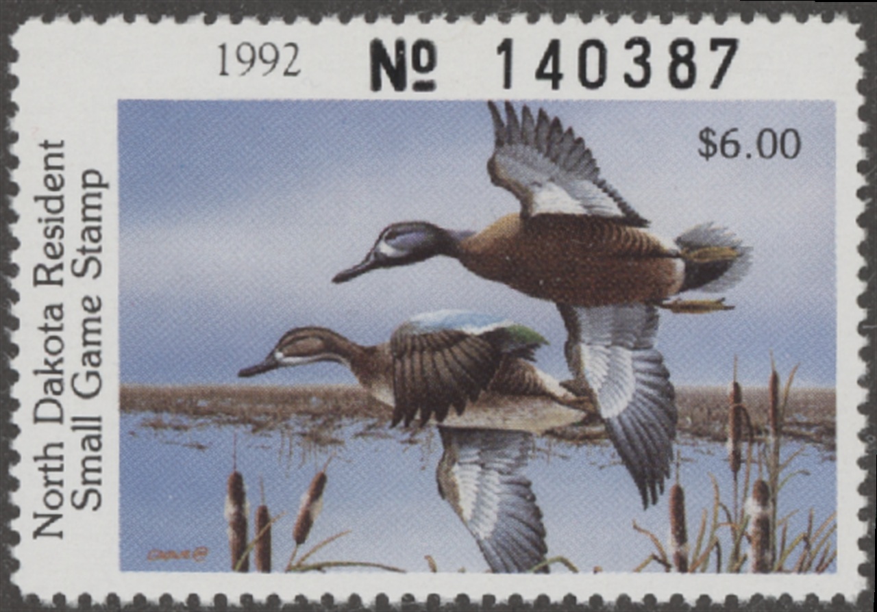 ND11 1992 State Duck Stamp. Mint Never Hinged. Very Fine. Blue-winged Teal by Phillip Crowe.