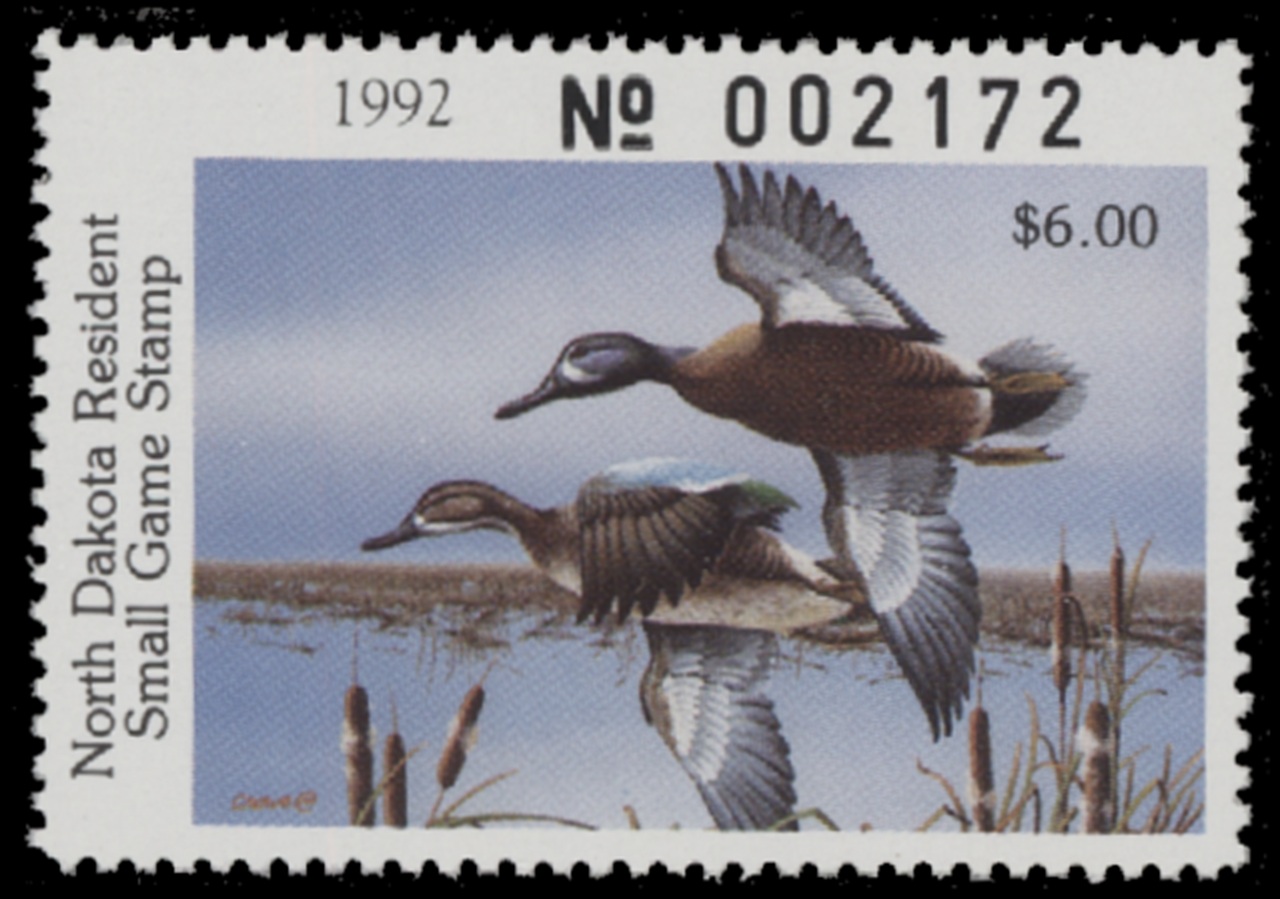 ND11 1992 State Duck Stamp. Mint Never Hinged. Very Fine. Blue-winged Teal by Phillip Crowe.