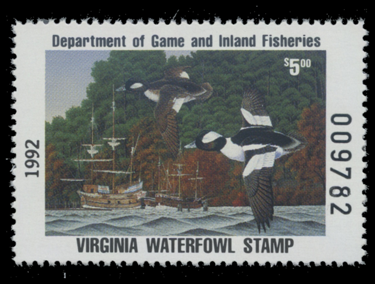 VA5 1992 State Duck Stamp. Mint Never Hinged. Very Fine. Buffleheads by Carl "Spike"Knuth.