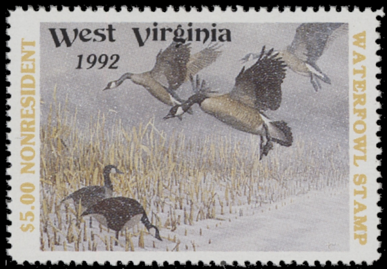 WV6NR 1992 State Duck Stamp. Mint Never Hinged. Very Fine. Canada Geese by Tom Hirata.