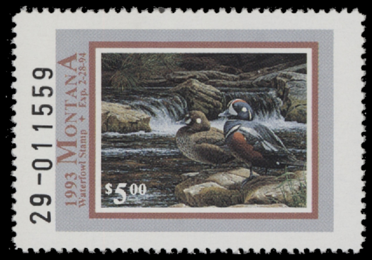 MT8 1993 State Duck Stamp. Mint Never Hinged. Very Fine. Harlequin Ducks by Darrell Davis.