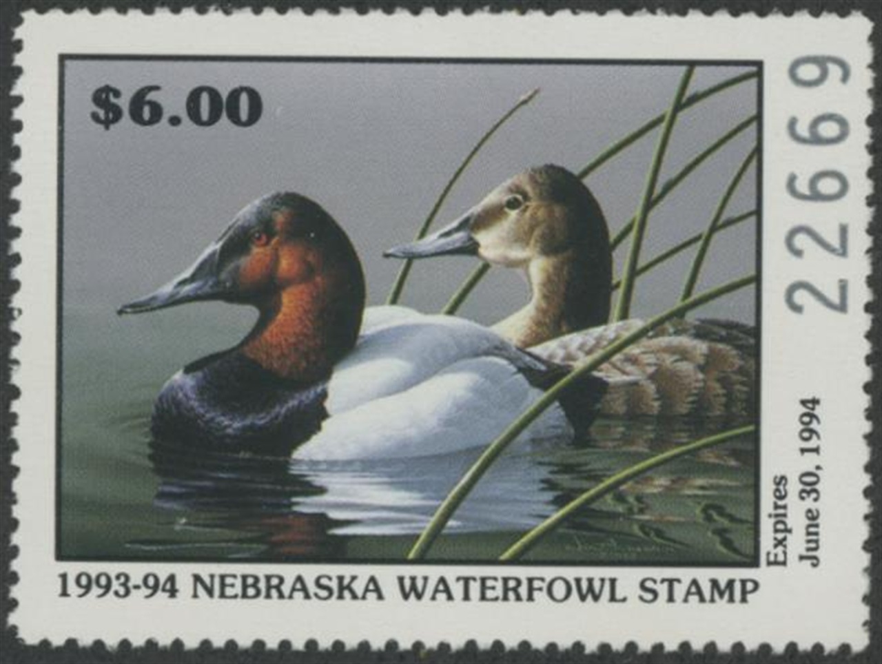 NE3 1993 State Duck Stamp. Mint Never Hinged. Very Fine. Canvasbacks by Neil Anderson.