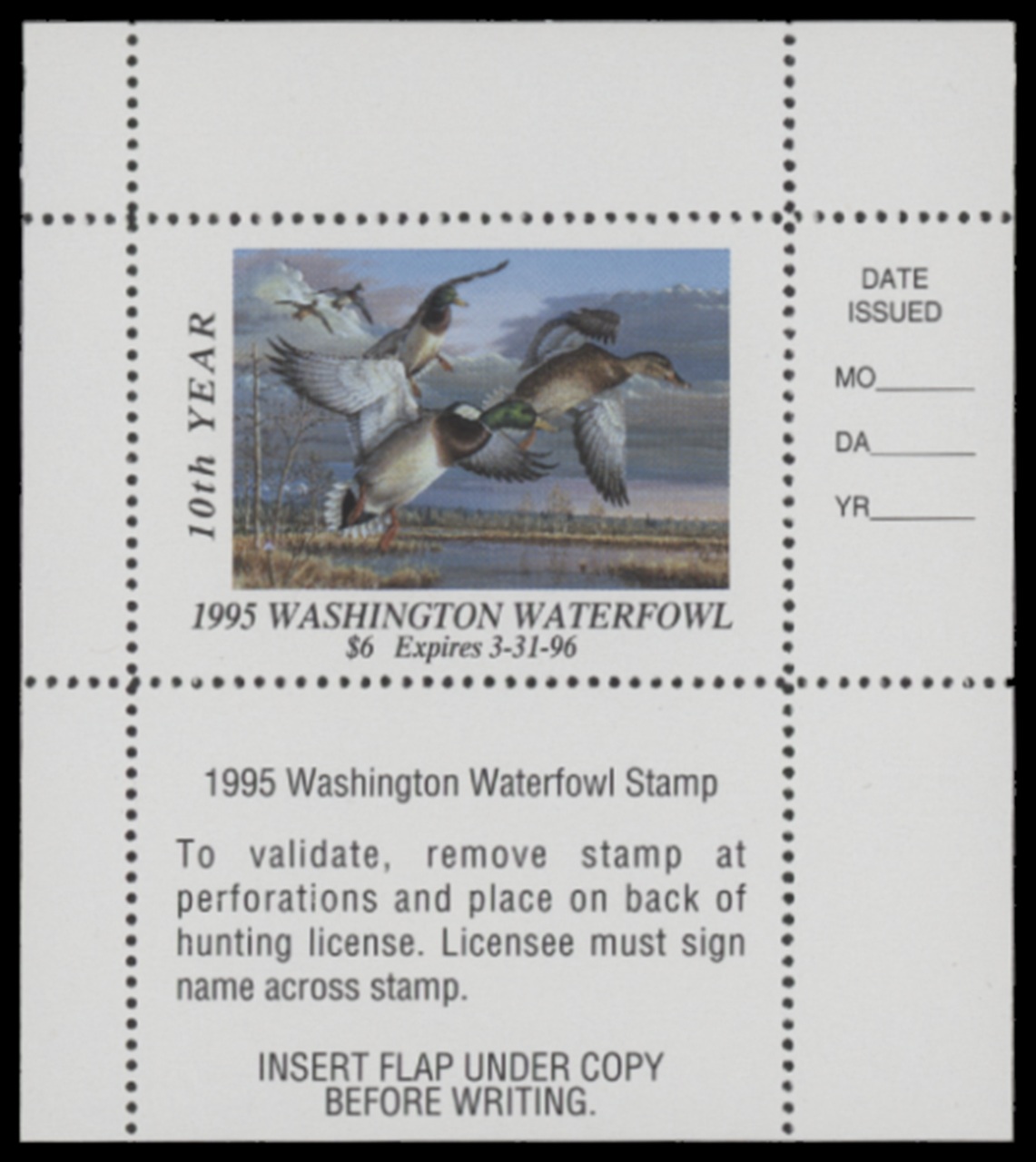 WA10 1995 State Duck Stamp. Mint Never Hinged. Very Fine. Mallards by Cynthie Fisher.