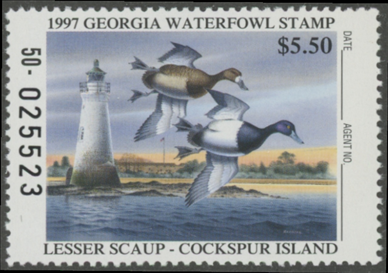GA13 1997 State Duck Stamp. Mint Never Hinged. Very Fine. A Pair of Lesser Scaup by Jerry Raedeke.