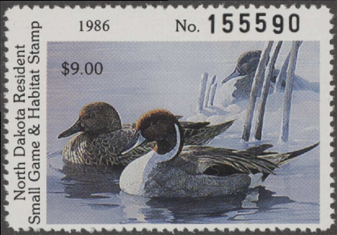 ND5 1986 State Duck Stamp. Mint Never Hinged. Very Fine. Pintails by Mario Fernandez.