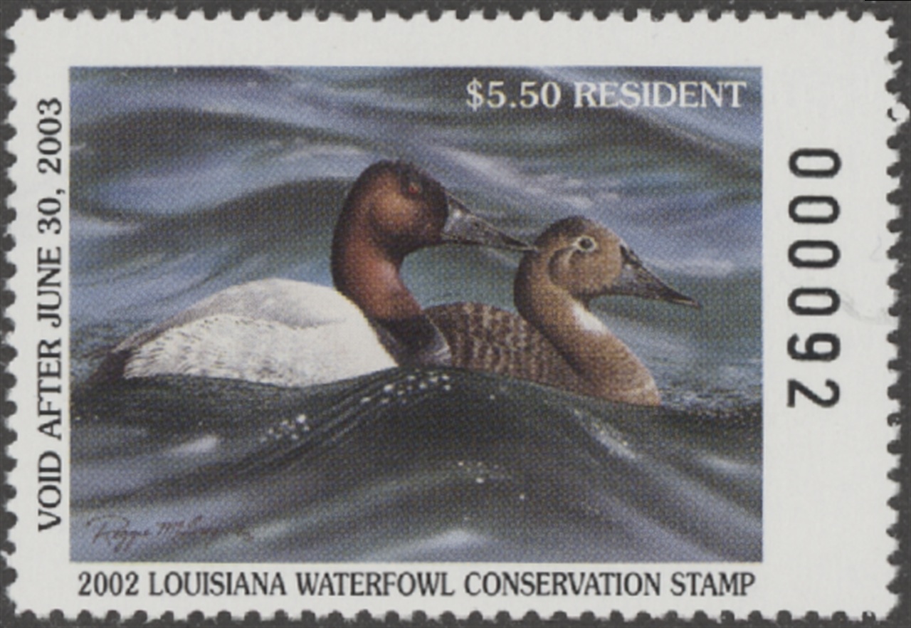LA14 2002 State Duck Stamp. Mint Never Hinged. Very Fine. Canvasbacks by Reggie McLeroy.
