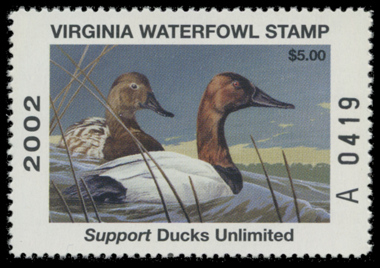 VA15 2002 State Duck Stamp. Mint Never Hinged. Very Fine. Canvasbacks by Jim Wilson.