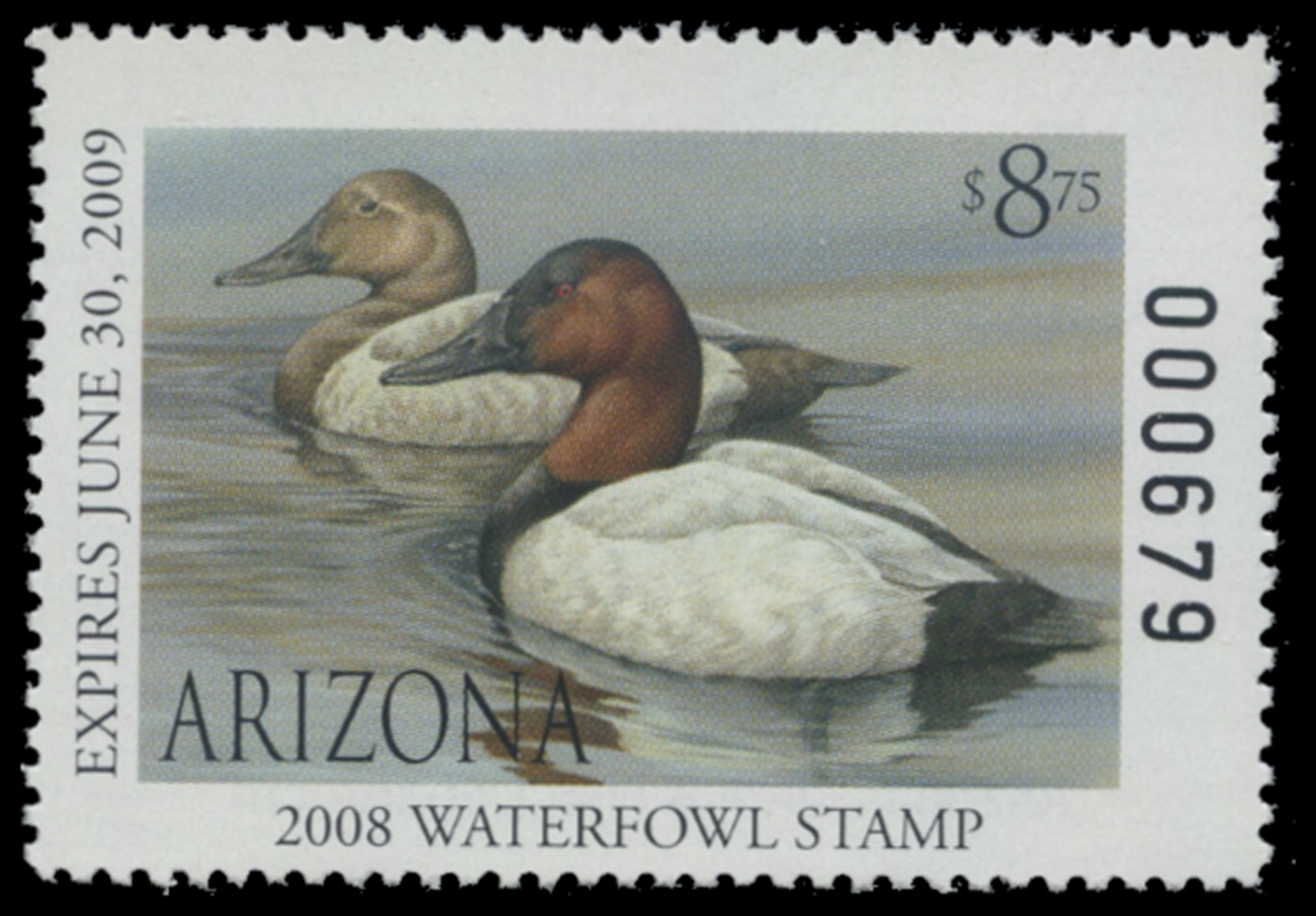 AZ22 2008 State Duck Stamp. Mint Never Hinged. Very Fine. Canvasbacks by Sherrie Russell Meline.