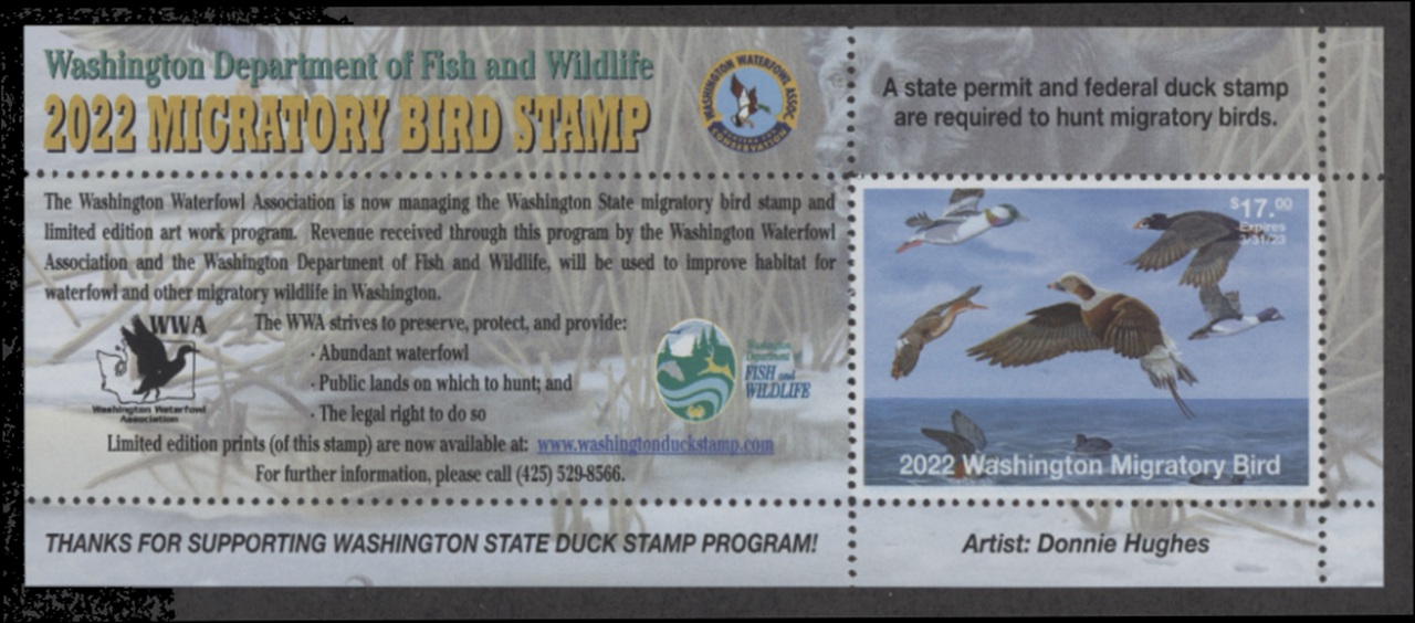 WA37H 2022 State Duck Stamp. Hunter Type Mini Sheet. Mint Never Hinged. Very Fine. Don't know by Don't care.