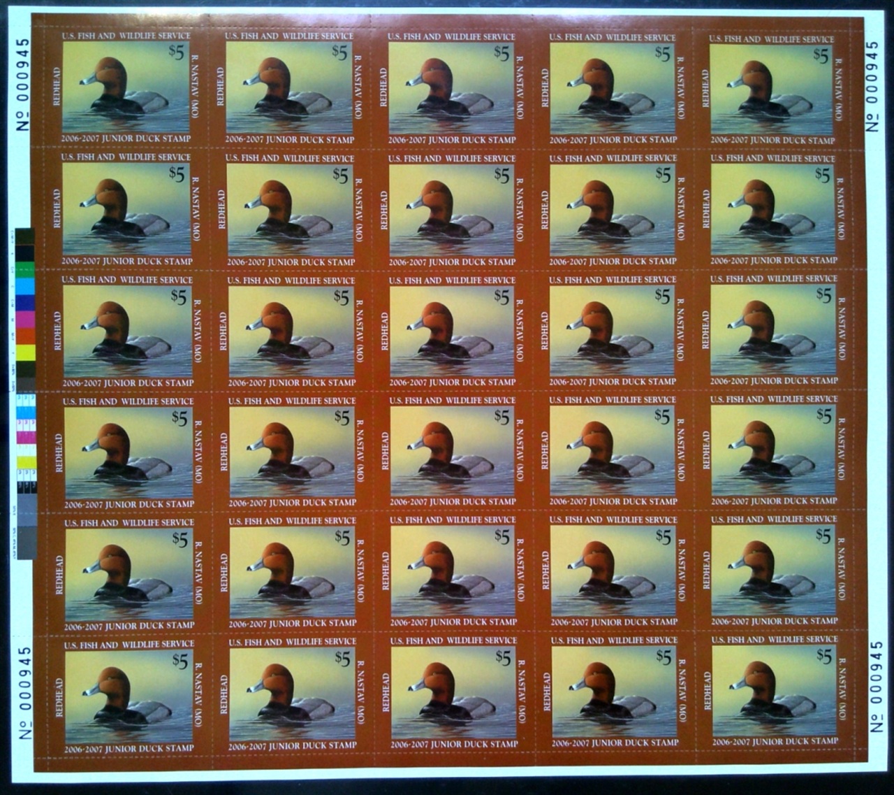 JDS14 2006 Junior Duck Full Sheet of 30 Stamps. Post Office Fresh. Sheet Number 000945. Mint Never Hinged. Very Fine. Redhead Duck by Rebekah Nastav.