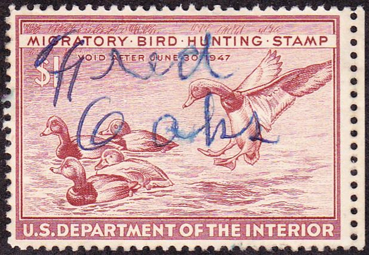RW13 1946 Federal Duck Stamp. Used with Most Original Gum. Fine - Very Fine Centering. Redhead Ducks by Robert W. Hines.