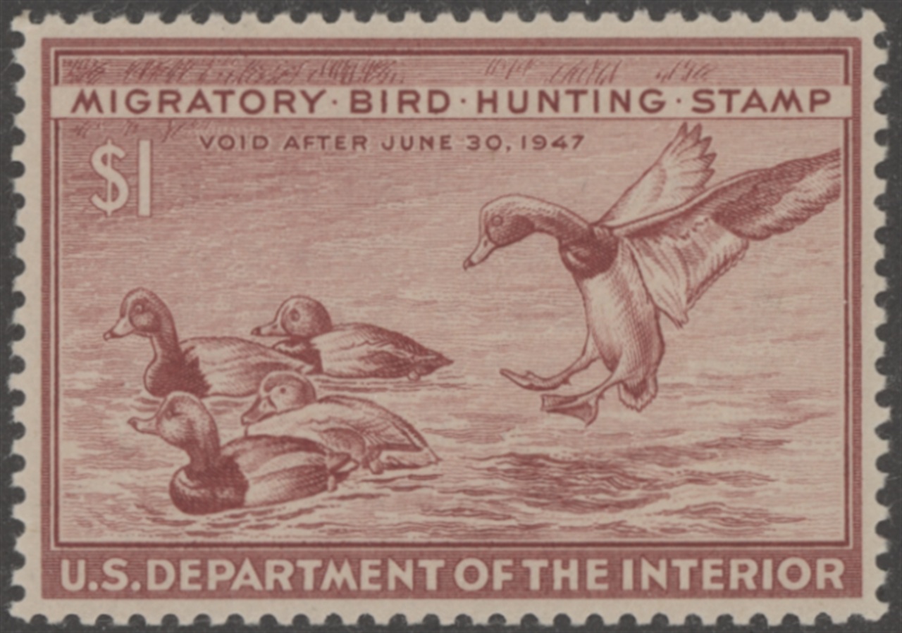 RW13 1946 Federal Duck Stamp. Mint Never Hinged. Very Fine Centering. Redhead Ducks by Robert W. Hines.