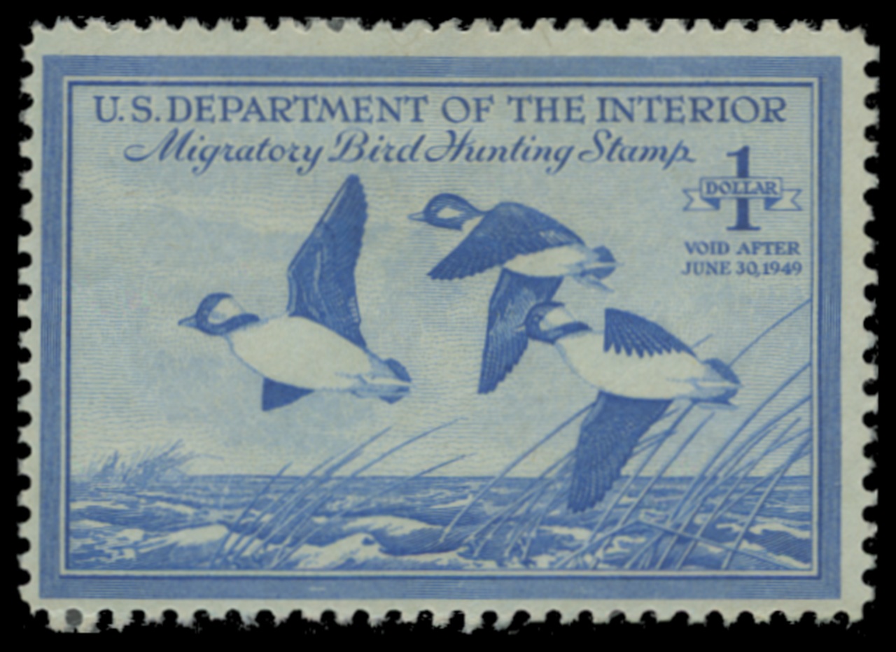 RW15 1948 Federal Duck Stamp. Mint Lightly Hinged. Fine - Very Fine. Buffleheads by Maynard Reece.