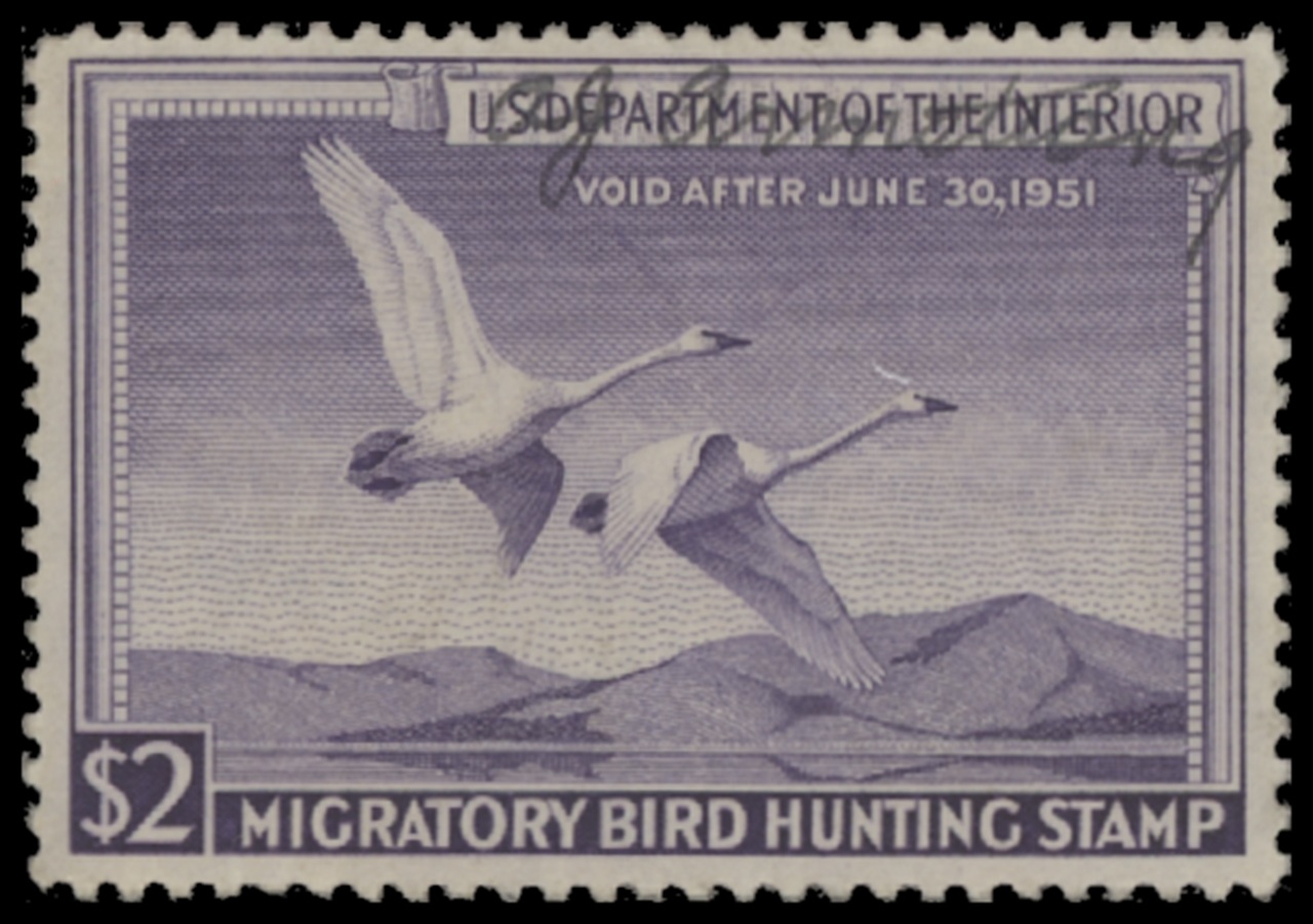RW17 1950 Federal Duck Stamp. Used. Fine - Very Fine. Trumpeter Swans in Flight by Walter Weber.