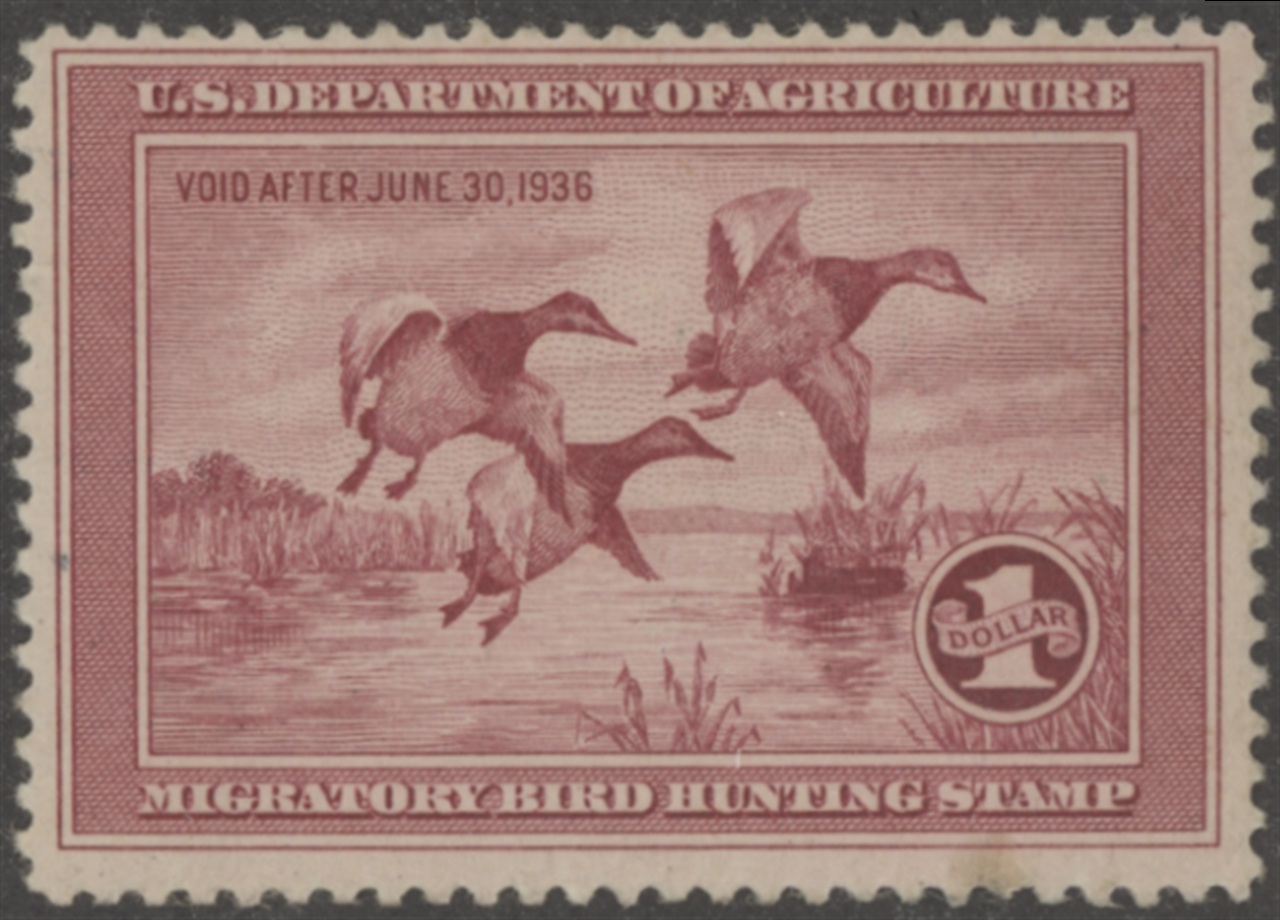 RW2 1935 Federal Duck Stamp. Mint Never Hinged, Regum?, Tiny Stain Bottom right. Fine Centering. Canvasbacks Taking to Flight by Frank Benson.