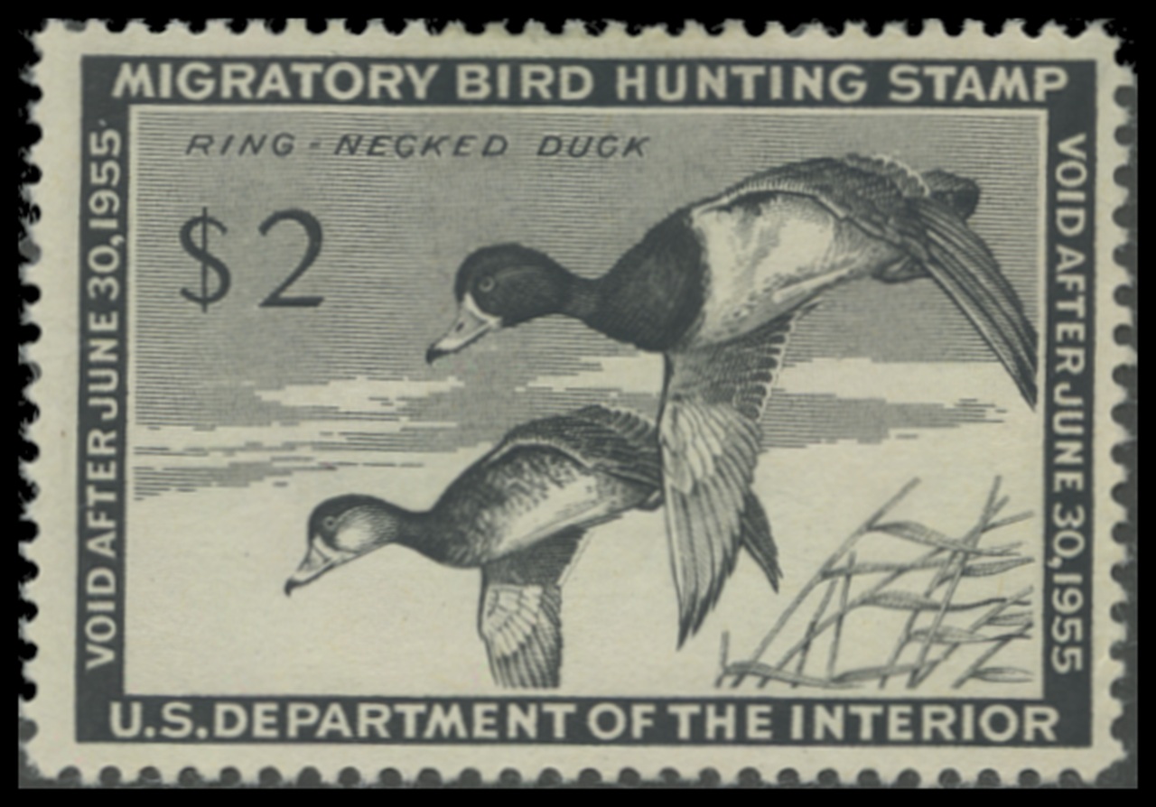 RW21 1954 Federal Duck Stamp. Mint Lightly Hinged. Fine - Very Fine. Ring-necked Duck by Harvey Sandstrom.