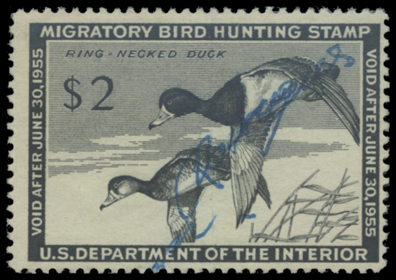 RW21 1954 Federal Duck Stamp. Used. Fine - Very Fine. Ring-necked Duck by Harvey Sandstrom.