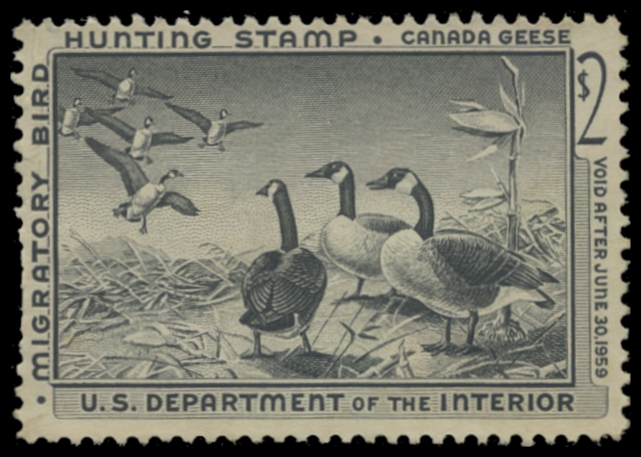 RW25 1958 Federal Duck Stamp. Unsigned, No Gum. Fine - Very Fine. Canada Geese by Lou Kouba.