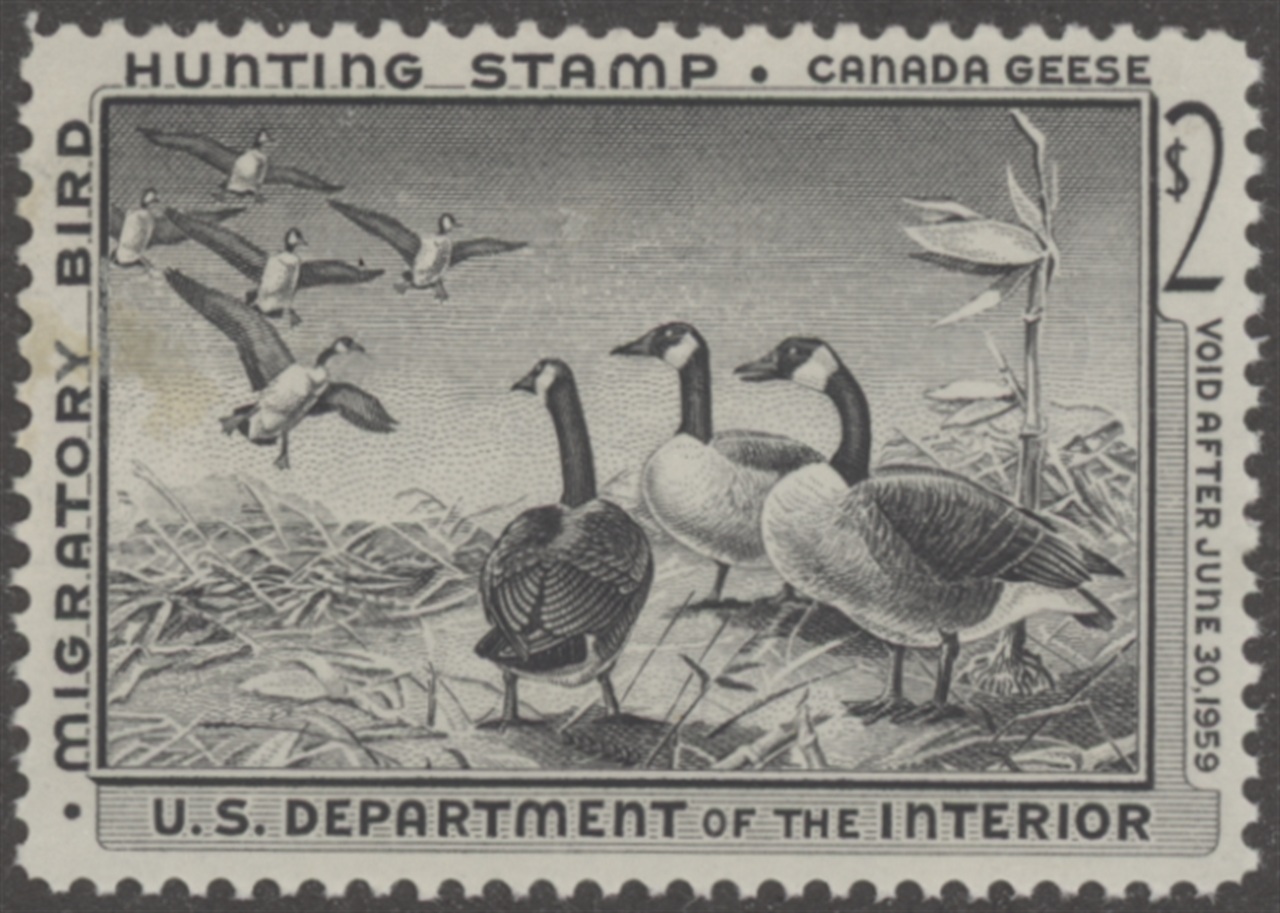 RW25 1958 Federal Duck Stamp. Mint Lightly Hinged, Small Stain Left Side. Very Fine Centering. Canada Geese by Lou Kouba.