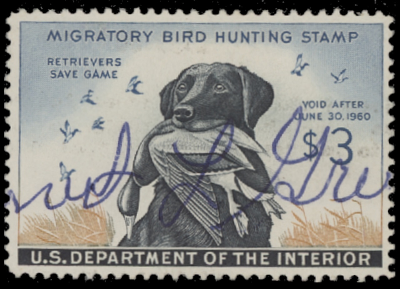 RW26 1959 Federal Duck Stamp. Used. Fine - Very Fine. Black Lab with Drake Mallard by Maynard Reese.