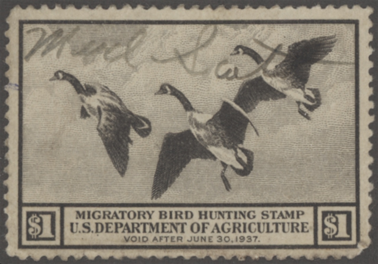 RW3 1936 Federal Duck Stamp. Used, Light Signature. Very Fine Centering. Canada Geese in Flight by Richard Bishop.