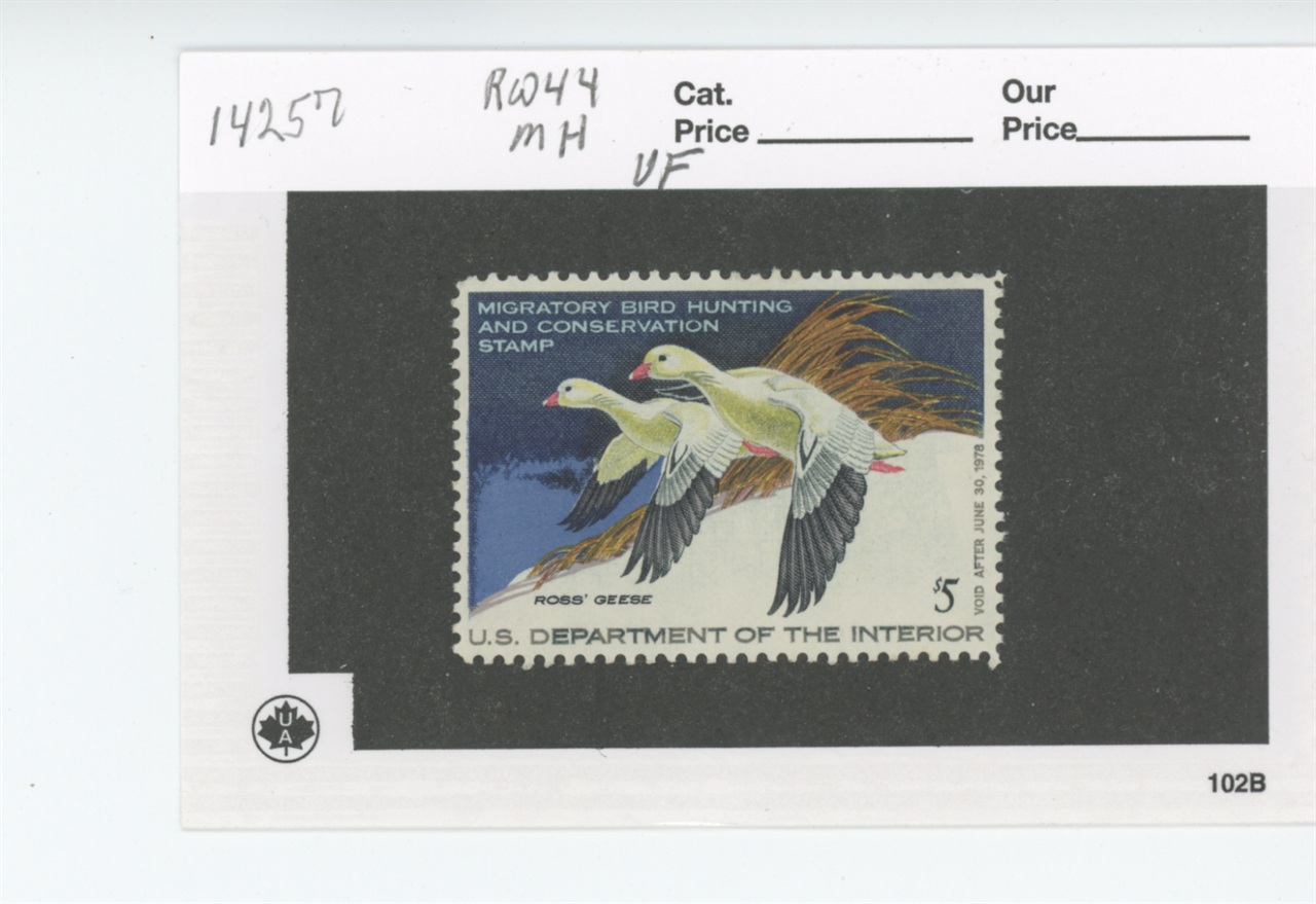 RW44 1977 Federal Duck Stamp. Mint Lightly Hinged Twice. Very Fine Centering. Ross's Geese by Martin R. Murk.