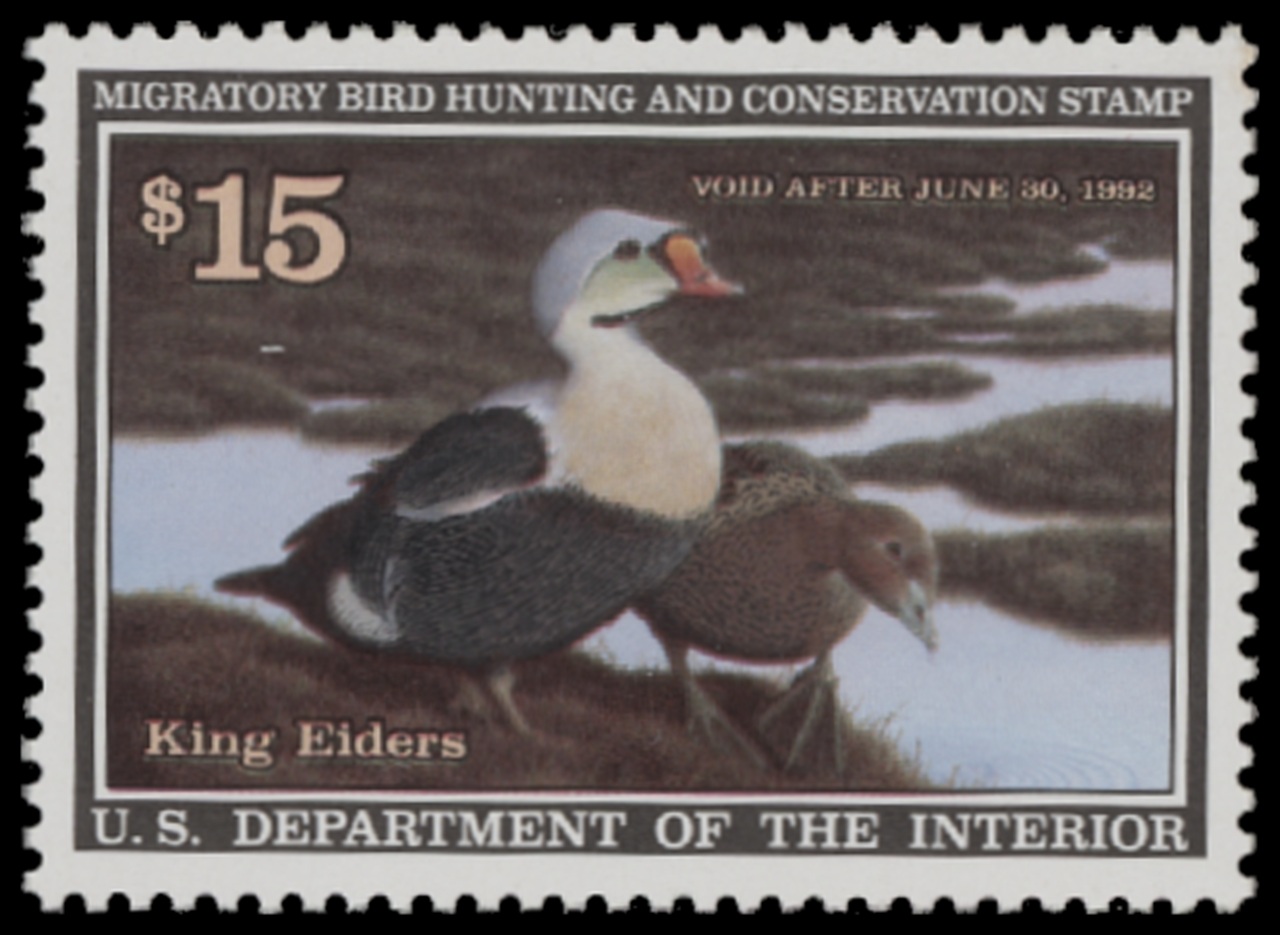RW58 1991 Federal Duck Stamp. Mint Never Hinged. Fine - Very Fine. King Eiders by Nancy Howe.