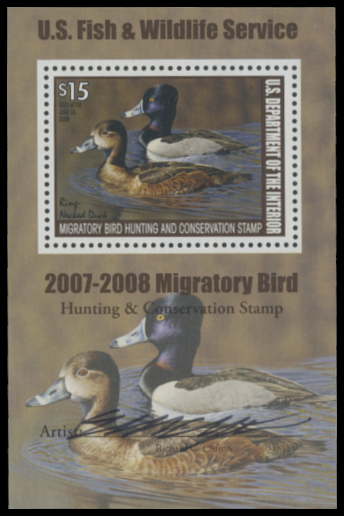 RW74B 2007 Federal Duck Stamp. Mint Never Hinged. Fine - Very Fine. Ring-necked Duck by Richard Clifton.