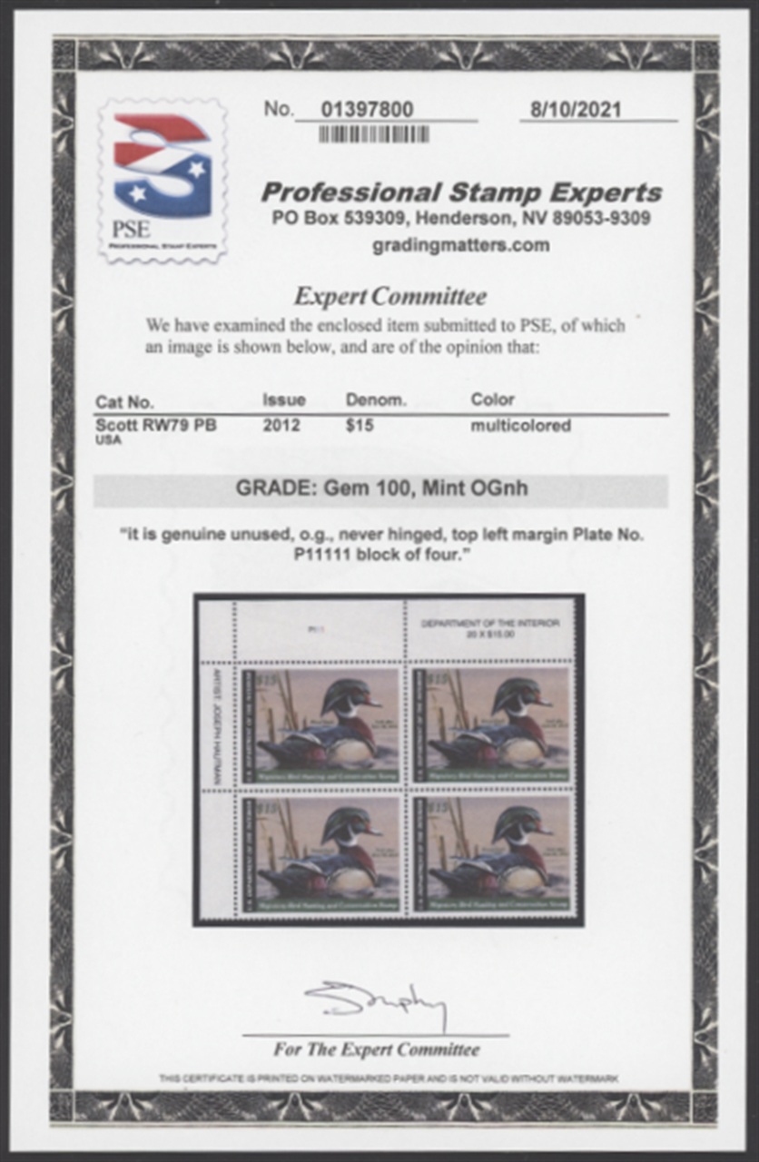 RW79 2012 Federal Duck Stamp. Mint Never Hinged Top Left Plate Block. Graded 100 GEM by PSE. Drake Wood Duck by Joe Hautman.