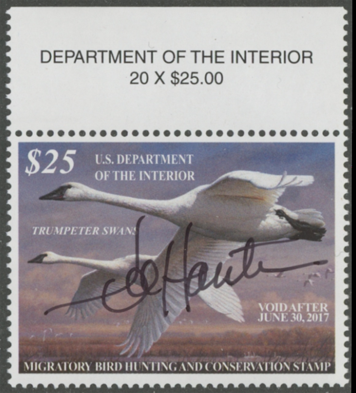 RW83 2016 Federal Duck Stamp. Never Hinged, Signed by Artist. Very Fine. Trumpeter Swan by Joe Hautman.